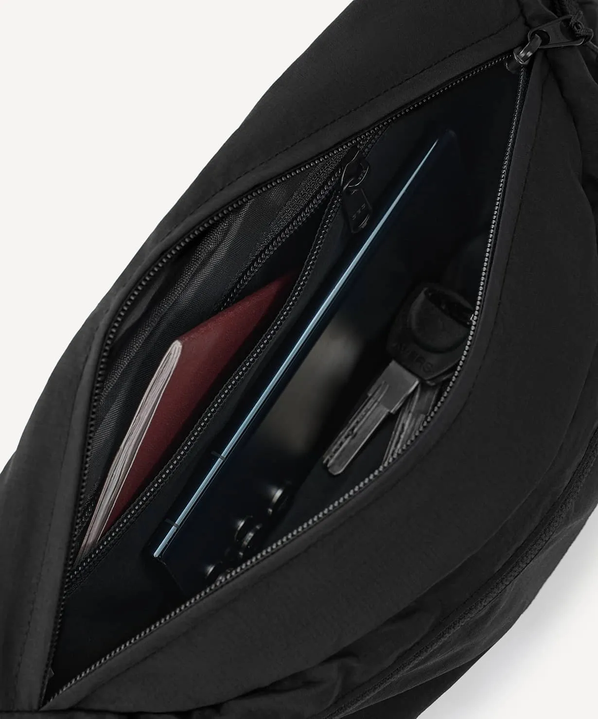 Регулируемый ремень позволяет настроить длину под индивидуальные параметры. Внешний и внутренний карман закрываются на надежные молнии и помогают организовать удобное хранение вещей.